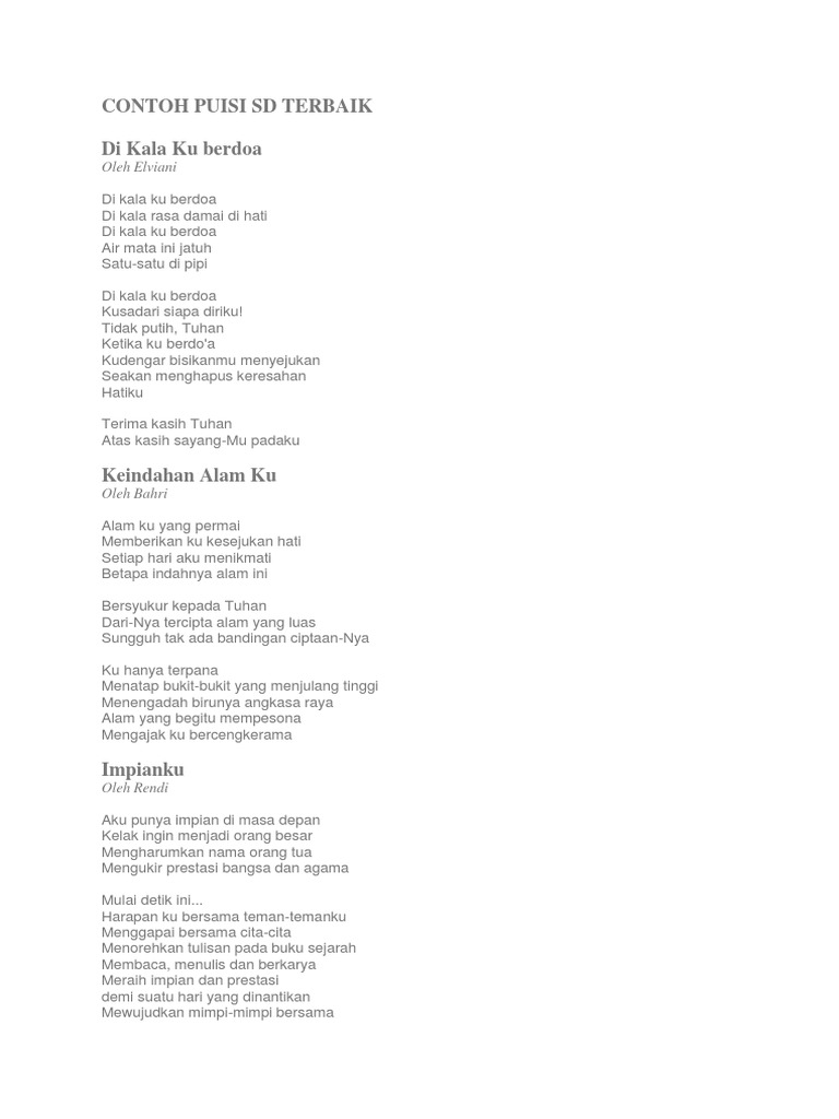 مُطِرَ النَّاسُ على عهدِ النَّبيِّ صلَّى اللَّهُ عليهِ وسلَّمَ فقالَ النَّبيُّ صلَّى اللَّهُ عليهِ وسلَّمَ أصبحَ منَ النَّاسِ. Akulah penopang hidup untuk keluarga. Tak peduli kata orang, namun, aku bersyukur. Masa depan, sukses, cinta, islami dll. Berikut kumpulan contoh puisi pendek dan panjang, puisi lama, baru, cinta kontemporer untuk guru, ibu sahabat, alam yang dapat kamu jadikan sebagai. Walau banyak rintangan yang harus dihadapi. Bulan ramadhan merupakan bulan yang penuh berkah dan penuhdengan kemuliaan. Mereka mengajarkan beragam hal yang berguna, dari membaca, berhitung. Adakala ya yang terindah bukanlah yang terbaik. Contoh puisi galau tentang hidup. Pasti ada setiap titik seseorang merasakan patah semangat, down, tidak bergairah. Yang sempurna tak menjanjikan kebahagiaan. Dari kisah orang lain, kita pun dapat memetik pelajaran.